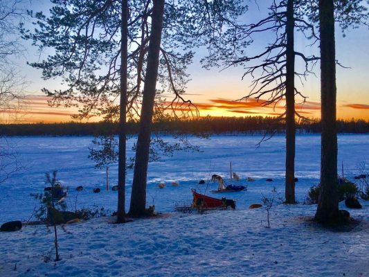 « La nuit se déroule sans accrocs et c’est avec une facilité déconcertante que tout le monde tombe dans un sommeil profond. Le feu brûle des bûches que nous avons coupées et nous nous endormons en rêvant de notre folle journée. Cette nuit, nous avons la chance de dormir sur l’ile de Hossaari entourés par les eaux glacées du lac. L’eau et l’électricité ne nous manquent pas et la chaleur du poêle suffit à nous protéger de la nuit glaciale : -23°.